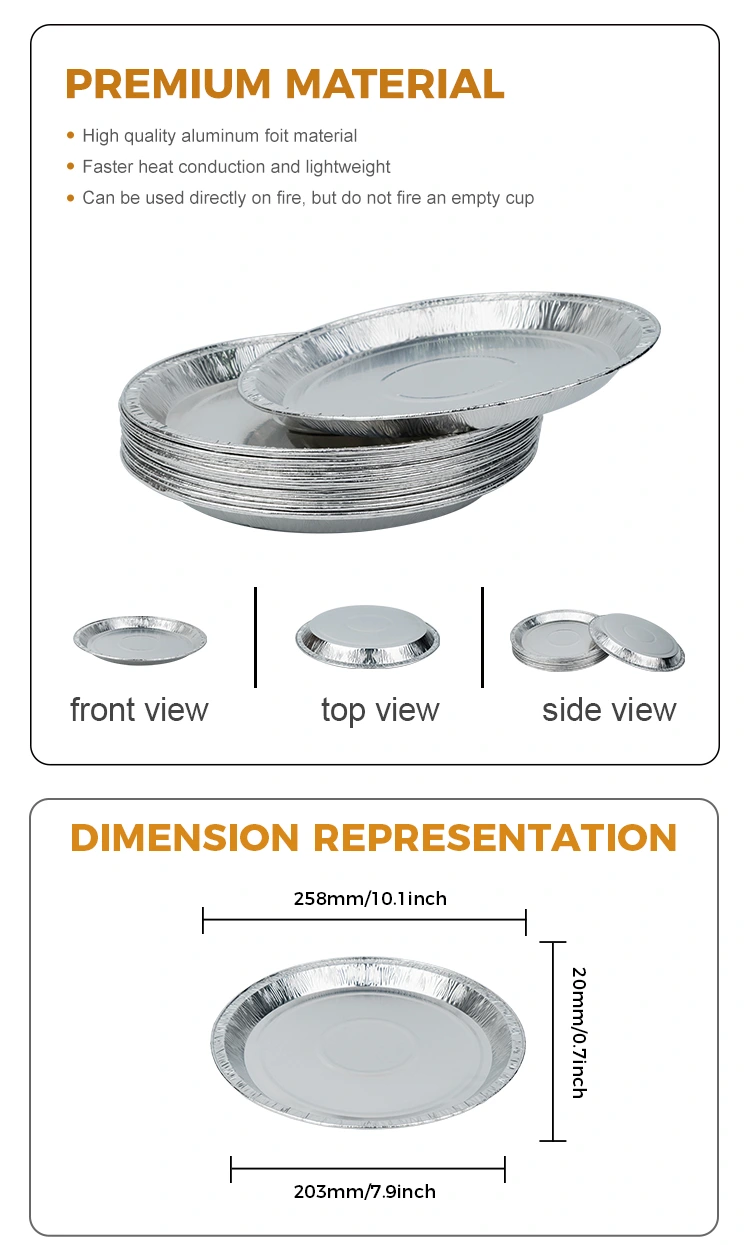 Yunchu aluminiumfolie biedt een 10 inch pizzapan zilver aluminiumfoliecontainers met modelnummer 13110. Het product heeft een bovendiameter van 258 mm (ongeveer 10,1 inch), een lagere diameter van 203 mm (ongeveer 7,9 inch) en een hoogte van 20 mm (ongeveer 0,7 inch). Met een capaciteit van ongeveer 695 ml (ongeveer 24,5 gram) is het geschikt voor het bakken van pizza zonder te blijven, gemakkelijk uit de mal los te laten, en heeft geen geur. Bovendien voorkomt het verhoogde randontwerp dat ingrediënten morsen en verhoogt hij de bruikbaarheid. We kunnen ook logo -aanpassingsdiensten bieden om u te helpen de indruk van uw klanten te verdiepen en uw merkbekendheid te verbeteren.