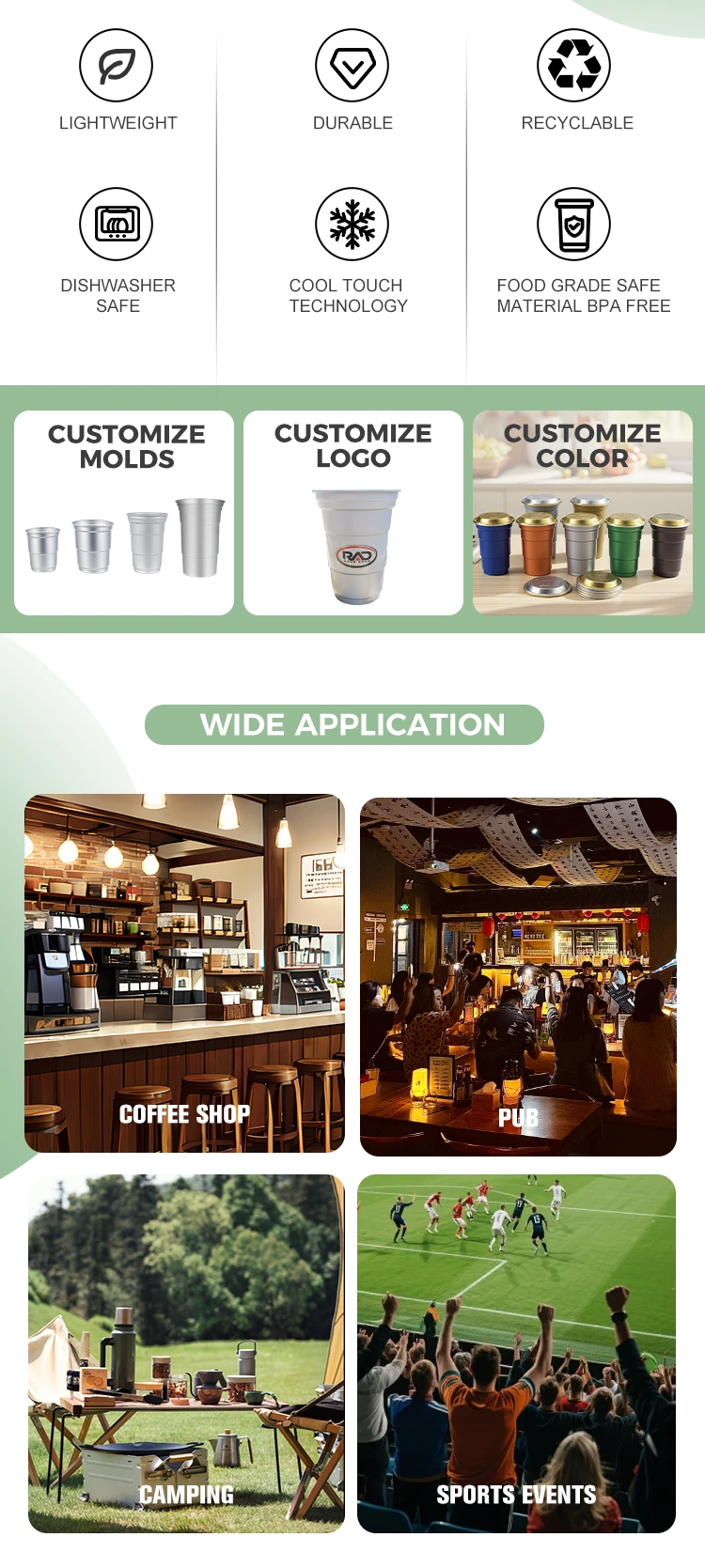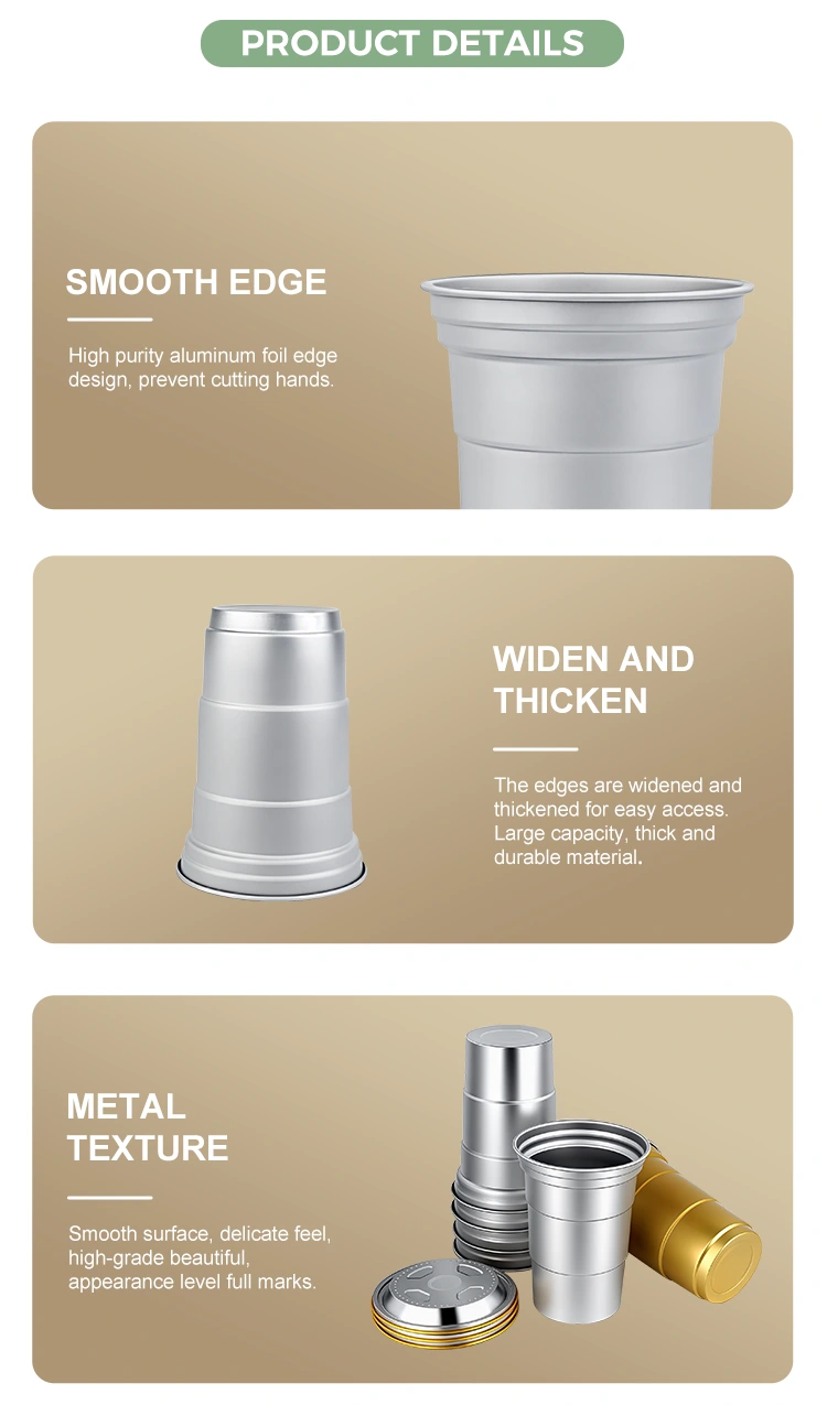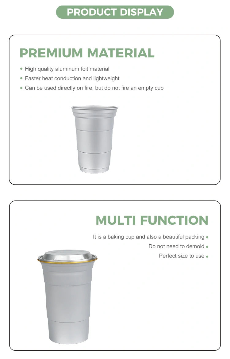 Deze 16oz wegwerp op maat gemaakte aluminiumfolie bier- en koffiedrankbeker kan direct in de koelkast worden geplaatst om te worden gekoeld. Bij het bewaren van koude dranken zorgt de warmtegeleiding van het aluminiummateriaal ervoor dat de koude temperatuur behouden blijft.