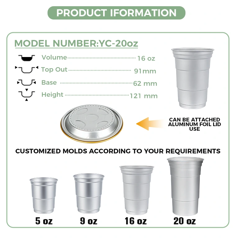 Yunchu is een toonaangevende fabrikant van op maat gemaakte aluminiumfolie drinkbekers van 16 oz. Deze 16oz wegwerpbeker van aluminiumfolie op maat is een aluminiumfoliebeker van 460 milliliter, geschikt voor standaarddranken zoals koffie en bier. Het heeft een gestandaardiseerd ontwerp en is vooral gericht op commerciële gebruikers zoals coffeeshops en ambachtelijke bars met frequente aanpassingsbehoeften. Deze 16oz wegwerpbare, op maat gemaakte, recyclebare drinkbeker van aluminiumfolie biedt weliswaar efficiënte warmtegeleiding en basisafdichtingsprestaties, maar legt ook meer nadruk op snelle en flexibele visuele aanpassingsdiensten voor het merk.