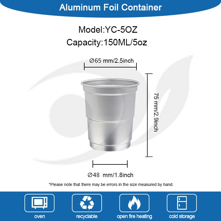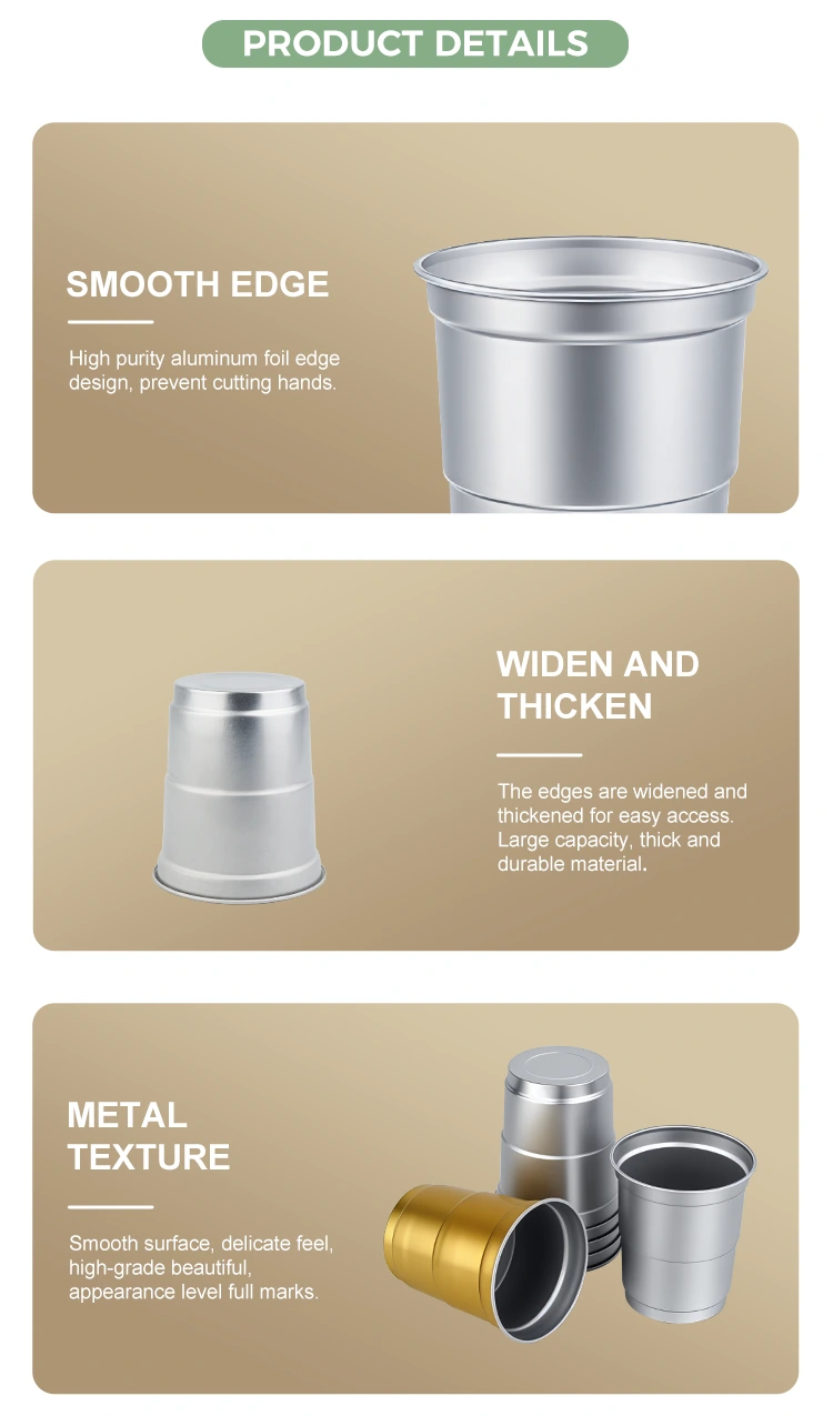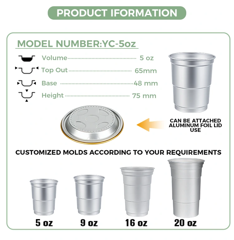 De 5oz wegwerp recyclebare aluminium drankbeker voor koude dranken van Yunchu-aluminiumfolieleverancier, met een eenvoudige en elegante aluminium metalen textuur, maakt deze drankbeker geschikt voor een breed scala aan scenario's, die meerdere velden bestrijken, zoals commerciële activiteiten, vrijetijdsbijeenkomsten, grootschalige evenementen, enz., en wordt de voorkeursoplossing voor op scenario's gebaseerde verpakkingen: