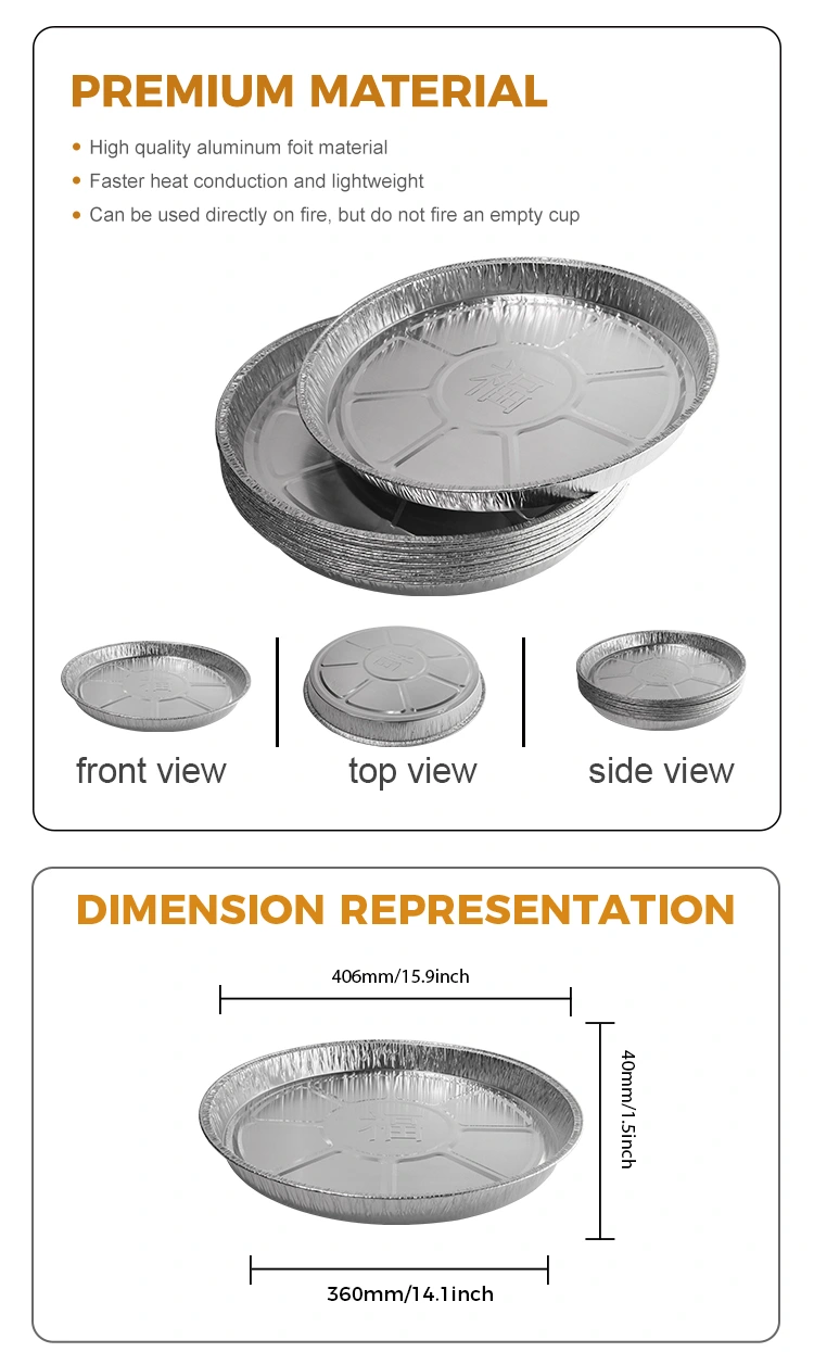 Yunchu Aluminium Foil Leverancier Model YR3700 Wegwerp Air Fryer Oven Zilver Aluminium Folie Voedingscontainer is voorzien. De container heeft een diameter van 406 mm (ongeveer 15,9 inch) aan de bovenkant, 360 mm (ongeveer 14,1 inch) in diameter aan de onderkant, een hoogte van slechts 40 mm (ongeveer 1,5 inch) en een capaciteit van ongeveer 3,700 ml (ongeveer 130,5 oz). Open vlam stomen is handig en hygiënisch, ovenbakken, hoge temperatuurweerstand 400 ° C wordt niet verbrand of gebroken, ovenbakken is niet plakkerig, niet bang voor vettige en opzettelijke barbecue, vanwege het vermogen om rechtstreeks contact op te nemen met open vlammen, gebruikers hoeven zich geen zorgen te maken over veiligheidsproblemen. Aluminiumfoliecontainers zijn bestand tegen hoge temperaturen, zeer bestand tegen bakken, en zijn niet gemakkelijk te verbranden of te breken. De rand van de volledige rol is olievrij, waardoor voedsel niet aan de muur van de pot blijft plakken en de bescherming is intiemer.