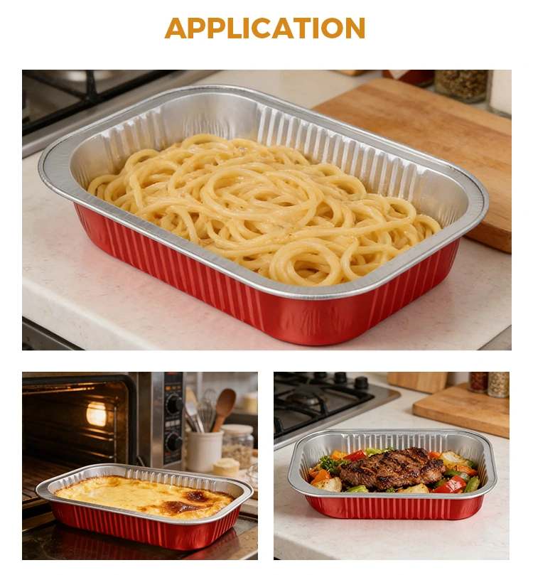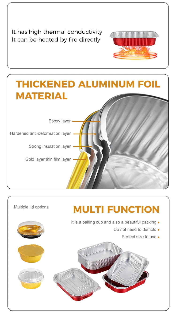 -Het materiaal van de rechthoekige rode aluminium afhaalcontainer kan de versheid en versheid van voedsel vasthouden. Dankzij de uitstekende warmtegeleidings- en isolatie-eigenschappen kan het direct worden verwarmd in de oven, magnetron en gekoeld in de koelkast, waardoor de oorspronkelijke smaak van de maaltijd effectief wordt vastgehouden en de ideale smaak lange tijd behouden blijft.
