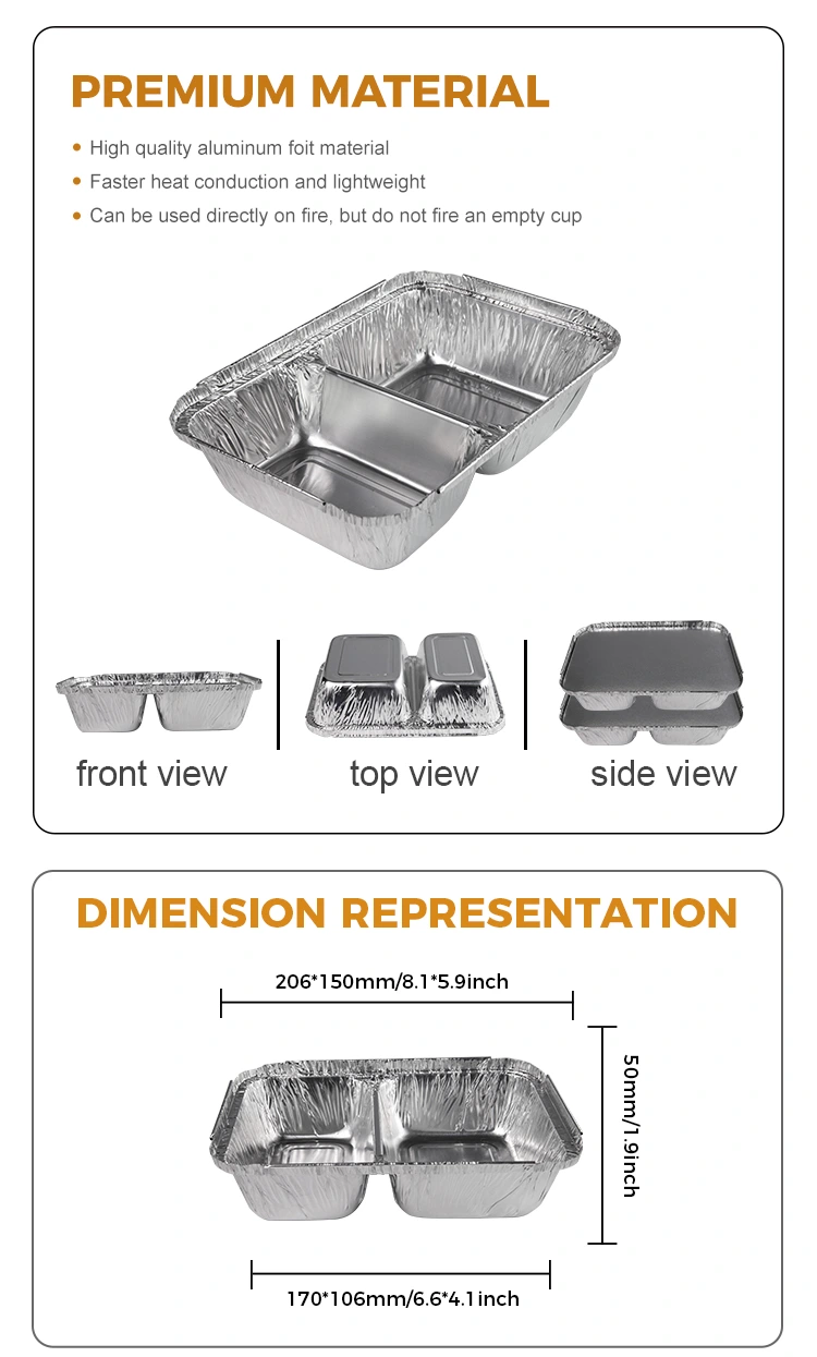 Het wegwerpcompartiment fastfood zilver aluminiumfoliecontainers met papieren deksel heeft een goed warmtebeperking en kan het verlies van voedselwarmte vertragen. In de herfst en winter heeft het een goed effect op het behoud van warm eten, zoals vers gemaakte hete stoofpot erin, die de temperatuur van de maaltijd gedurende een bepaalde periode kan handhaven, zodat consumenten kunnen genieten van warm voedsel tijdens het eten.