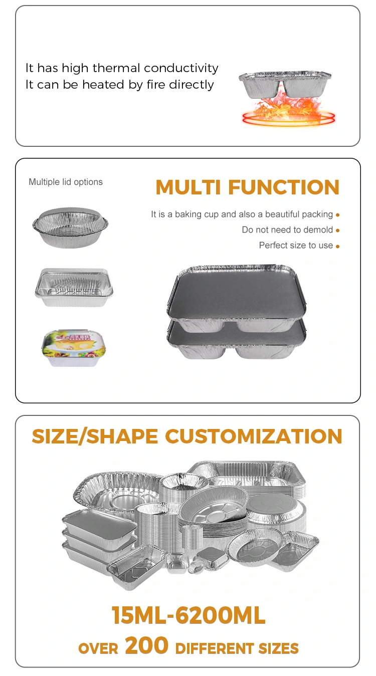 Het oppervlak van het wegwerpcompartiment fastfood zilver aluminiumfoliecontainers heeft een bepaalde glans, waardoor mensen een eenvoudige en schone visuele ervaring hebben. Tegelijkertijd heeft het een regelmatige vorm en kan het zich goed aanpassen aan verschillende verpakkings- en transportvereisten, zoals stapelen en plaatsing.