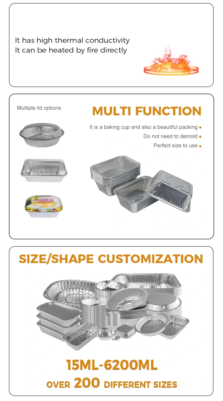 De wegwerpbare rechthoekige bakluchtfriteuse van de fabrikant van aluminiumfolie van Yunchu, de zilveren aluminiumfoliecontainer, is ontworpen voor keuken-, bak- en handige cateringbehoeften. Het maakt gebruik van aluminiumfolie van voedselkwaliteit als grondstof en is nauwkeurig gestempeld om rekening te houden met veiligheid, bruikbaarheid en milieubescherming. Het lost de pijnpunten van het vervelende schoonmaken na het bakken, het slechte aanpassingsvermogen van de container en de geur van ingrediënten volledig op, waardoor elke maaltijd gemakkelijk, zorgeloos, schoon en efficiënt wordt. De wegwerp rechthoekige bakluchtfriteuse zilveren aluminiumfoliecontainer heeft een bepaalde thermische geleidbaarheid, geleidt de warmte gelijkmatig en snel en kan zich nauwkeurig aanpassen aan de hoge temperatuuromgeving van de luchtfriteuse. Het is bestand tegen extreme temperaturen van -20°C tot 250°C.