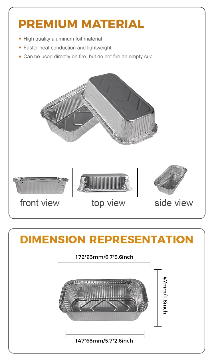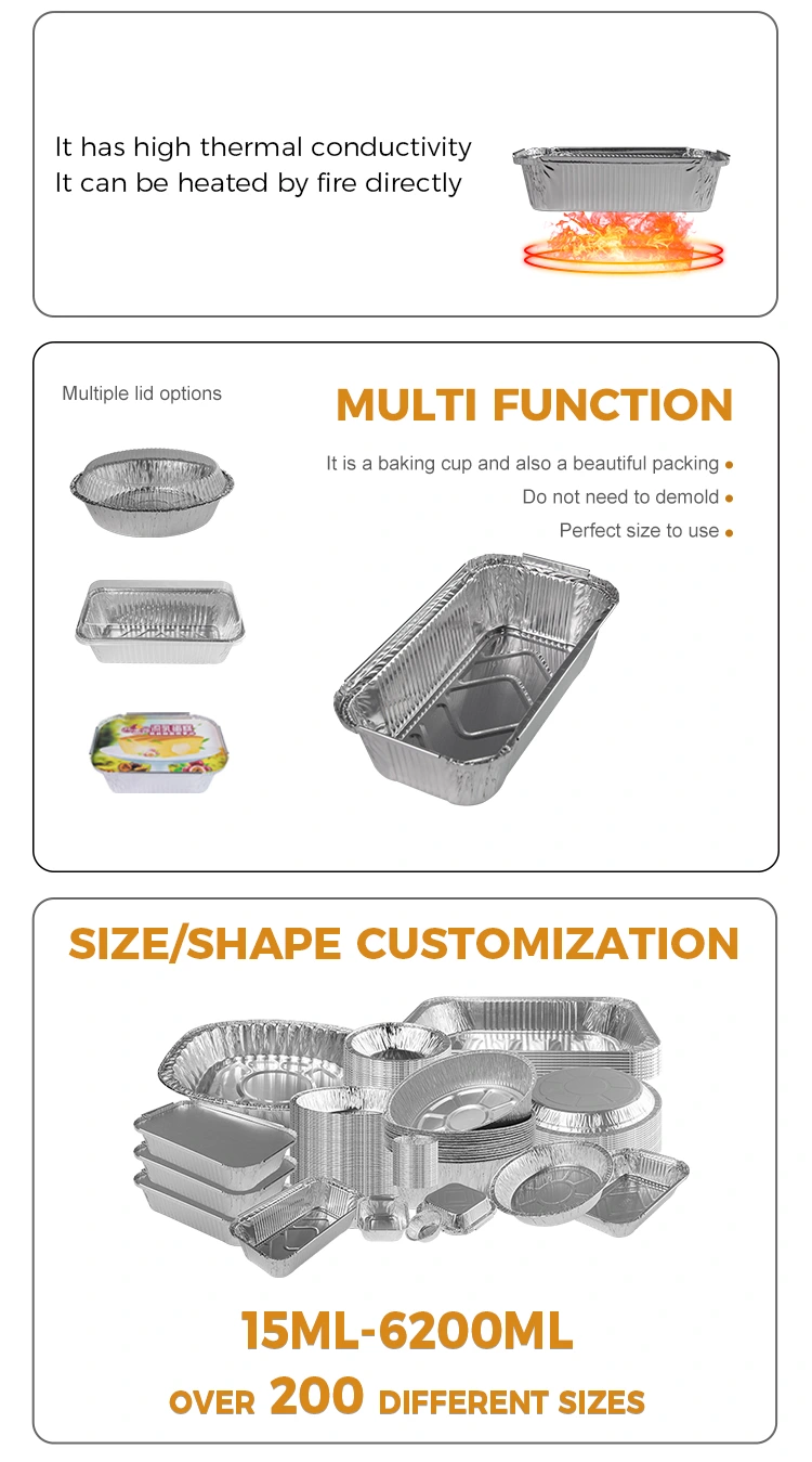 De wegwerp rechthoekige bakzilver aluminiumfoliecontainers van Yunchu aluminiumfolie Leverancier is een veelzijdig keukengereedschap dat geschikt is voor verschillende kookmethoden zoals grillen, hete pot, gratin, afhaalpakking en meer. Deze container is compact genoeg om te passen bij een verscheidenheid aan potten en apparatuur, en wordt geleverd in verschillende maten om te voldoen aan de behoeften van verschillende open vlambarbecues. Het kan worden gebruikt om verschillende voedselproducten te maken, zoals luchtfritenten en andere apparatuurtoepassingen, warmte en olieweerstand, gemakkelijk bakken.