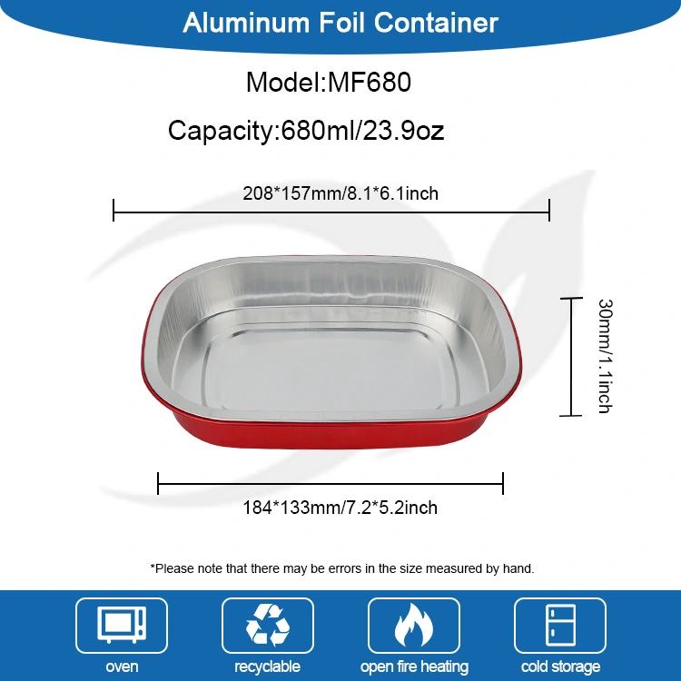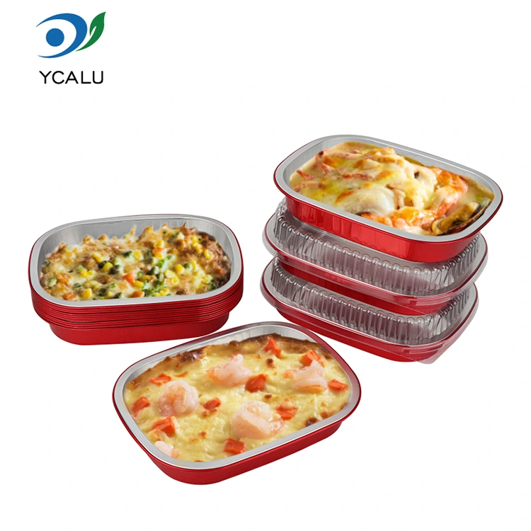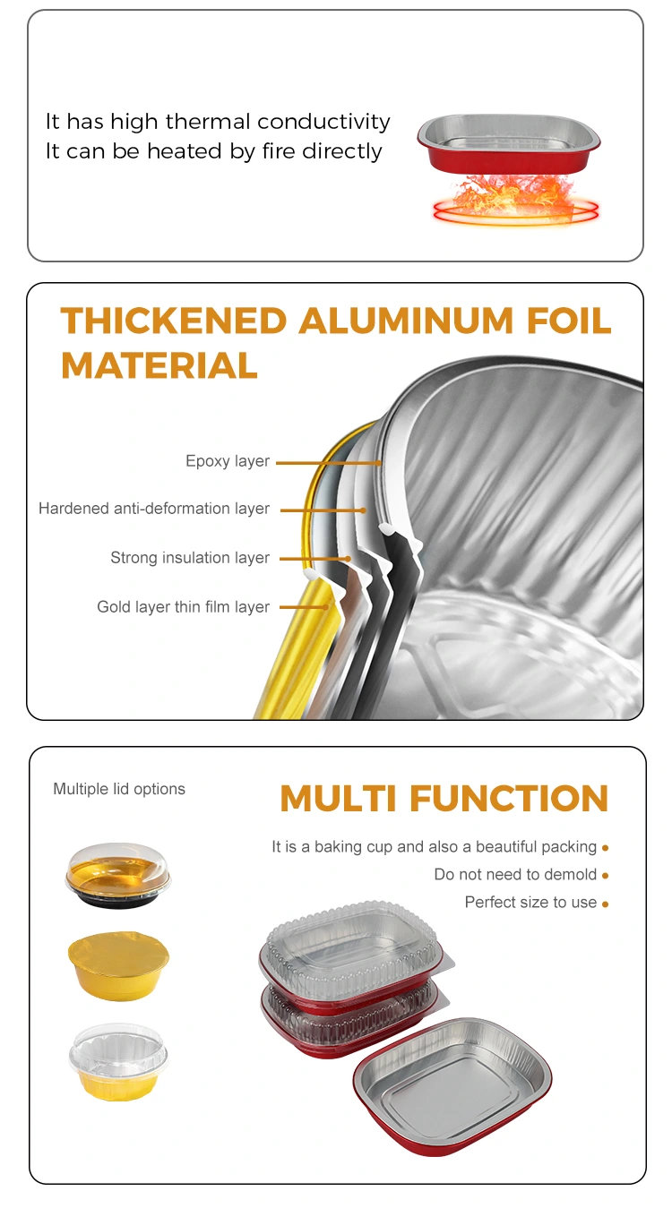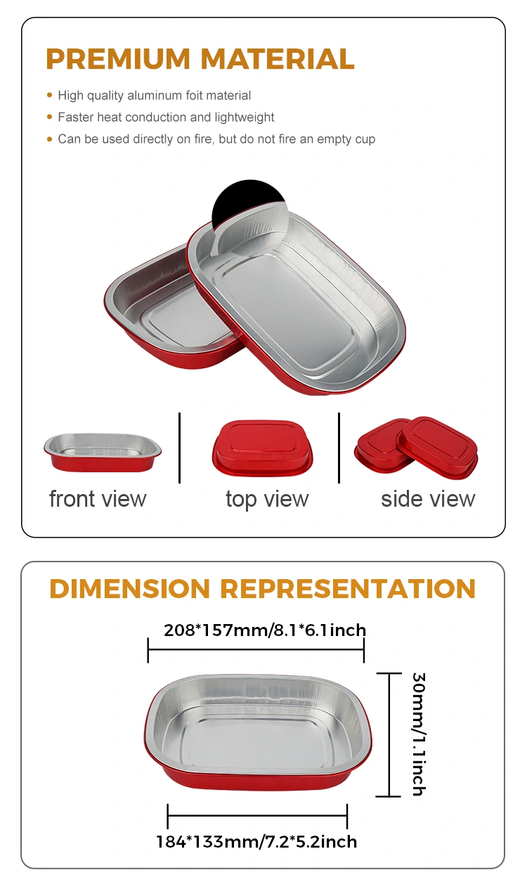 Yunchu is een professionele fabrikant en leverancier van aluminiumfoliecontainers in China. De wegwerpbare rode lunchbox vierkante aluminiumfoliecontainers die wij u leveren, hebben een diameter van 208 * 157 millimeter (8,1 * 6,1 inch). De onderste diameter is 184*133 (7,2*5,2 inch), de hoogte is 30 (1,1 inch) en de capaciteit is ongeveer 680 milliliter (23,9OZ). Het maakt gebruik van food-grade 8011 food-grade aluminiumfolie verdikt basismateriaal, dat rekening houdt met zowel de taaiheid als het draagvermogen, niet gemakkelijk te vervormen of te lekken is en voedsel direct kan ondersteunen. Het is compatibel met een ultrabreed temperatuurbereik van -20℃ tot 220℃. Er is geen ontkisting nodig. Het kan direct in de oven, airfryer of steamer worden geplaatst voor gebruik, maar kan ook in de koelkast worden bewaard voor conservering. Het biedt een alles-in-een handige ervaring van "bakken - opslag - consumptie - verwijdering". Het belangrijkste voordeel van aluminiumfolie is de hoge thermische geleidbaarheid. De gouden coating helpt de warmte vast te houden, waardoor het voedsel gelijkmatig en snel wordt verwarmd.