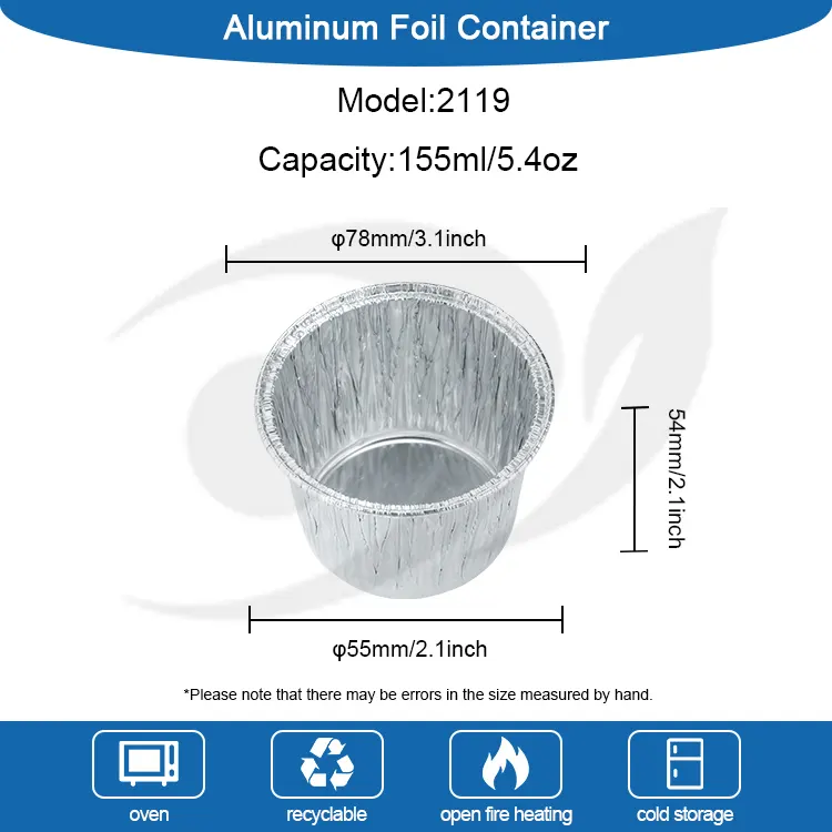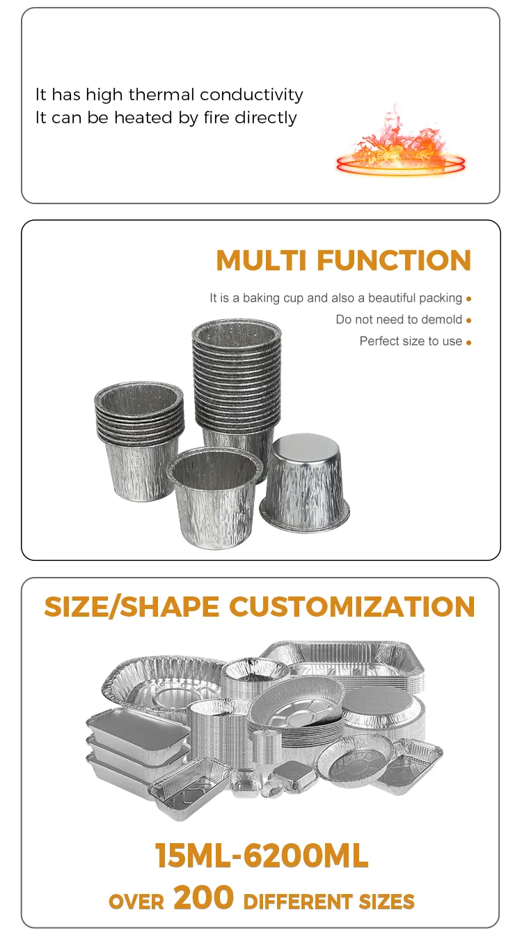 Yunchu Aluminiumfolie Fabrikant's wegwerpbare ronde cakebeker zilveren aluminiumfoliecontainer is gemaakt van voedselveilige, zeer zuivere aluminiumfolie. Het heeft strenge kwaliteitstesten ondergaan en is geurloos en bevat geen schadelijke toevoegingen. Direct contact met ingrediënten zorgt voor meer gemoedsrust en beschermt elke hap zoetheid en gezondheid. Het verdikte aluminiumfolieproces zorgt voor een stevig bekerlichaam dat niet gemakkelijk te vervormen of te breken is. Het kan gebruikt worden voor diverse cakebeslag, mousse, pudding en andere ingrediënten. Het is bestand tegen hoge temperaturen tot 250°C en lage temperatuurbestendigheid tot -20°C voor ovens, koelkasten, airfryers en andere apparaten. Het kan goed worden aangepast aan bakken, koelen en invriezen. Het is niet nodig om de aluminiumfoliedoos te vervangen en er zijn niet al te veel vervelende stappen. Het klassieke ronde ontwerp, het bekerlichaam is rond en glad, en de bijpassende zilvermetallic glans vereist geen extra decoratie. Het kan direct na het bakken worden geserveerd en het heeft een presentatie-effect op dessertwinkelniveau. De mond van de beker is fijn gekruld, waardoor deze glad aanvoelt en geen krassen op je handen veroorzaakt. Het voorkomt dat het beslag gaat lekken bij het ingieten en vergemakkelijkt het ontvormen.