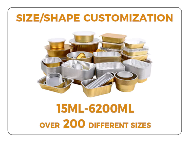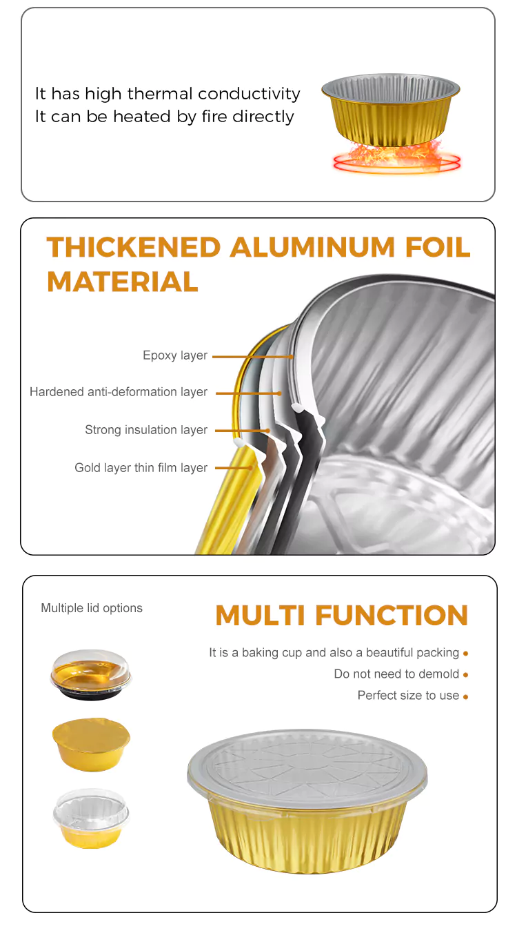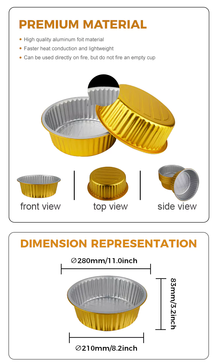 We concentreren ons op het sterke ontwerp van wegwerpbare ronde gouden aluminiumfoliecontainers met grote capaciteit. De wanddikte is wetenschappelijk geproportioneerd om zowel flexibiliteit voor eenvoudige vormgeving als voldoende draagvermogen te garanderen. Het is niet gevoelig voor vervorming of lekkage bij gebruik voor het vasthouden van soepen, gerechten, gebak, enz. De randen zijn behandeld met een opgerolde randproces, wat zorgt voor een soepele aanraking die geen krassen op de hand maakt, waardoor het veiliger in gebruik is. We bieden verschillende capaciteitsspecificaties voor uw selectie, variërend van mini-dessertdozen tot pakketten voor het delen van gezinnen, om tegemoet te komen aan de behoeften van verschillende scenario's. Of het nu gaat om afhalen in restaurants, het verpakken van eindproducten in bakkerijen of het thuis bewaren van zelfgemaakte delicatessen, het kan allemaal eenvoudig worden aangepast.