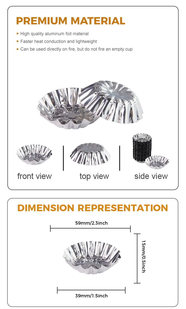 Yunchu aluminum foil supplier's Egg tarts are baked in an air fryer Silver Aluminum Foil Food Container, non-slip cup body, anti-slip pattern of the cup body, increase friction, prevent slipping, curled cup mouth, rounded curled cup mouth design does not hurt hands, multiple large capacity design, one-time use, no need to clean laboriously, wide range of uses, can be used for baked egg tarts, cakes, egg yolk Crisps, bowl -cakes en andere delicatessen. Yunchu heeft de Duitse ERP -certificering, de EU SGS -certificering en de ISO9001 Quality Management System -certificering doorstaan. We gebruiken gezonde, milieuvriendelijke materialen voor voedselkwaliteit om de veiligheid en niet-toxiciteit van onze producten te waarborgen. Deze materialen zijn niet alleen hernieuwbaar, maar ook milieuvriendelijk en weerspiegelen onze strenge vereisten in voedselveiligheid en onze toewijding aan het nastreven van hoogwaardige normen voor onze algemene producten.
