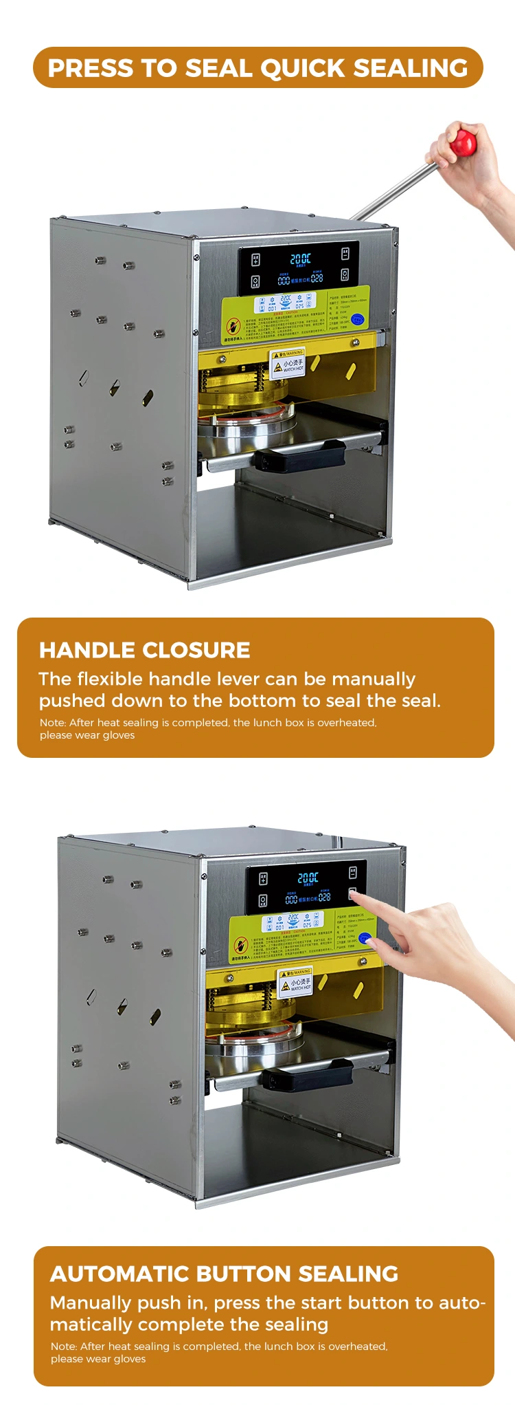 Efficiënter: Geen noodzaak om aparte sealfolies te gebruiken. De lunchboxen en heatsealers zijn direct klaar voor gebruik. Bij handmatige bediening hoeft u niet te wachten op het voorverwarmen. Kleine bestellingen kunnen snel worden verwerkt en grote bestellingen kunnen ook gestaag worden doorgevoerd. Het kan gemakkelijk omgaan met scenario's zoals piekuren tijdens diners en plotselinge stijgingen in festivalbestellingen.