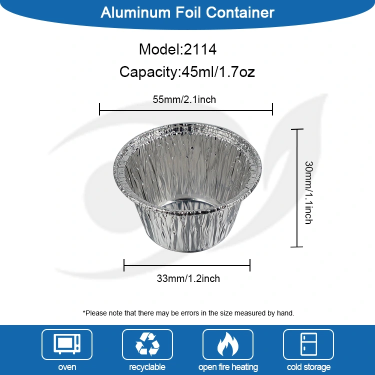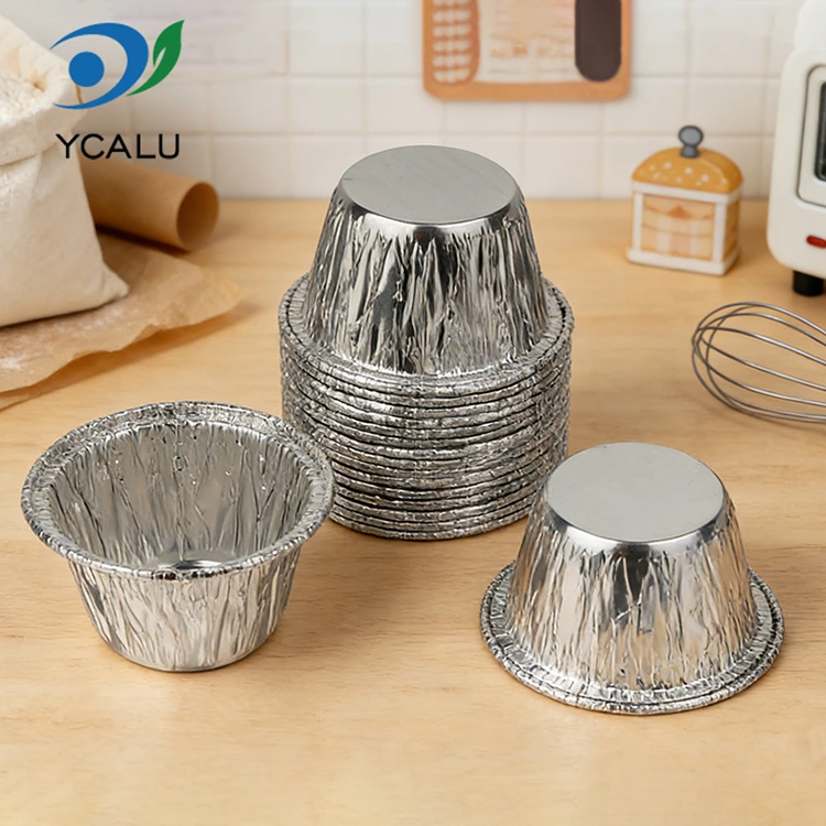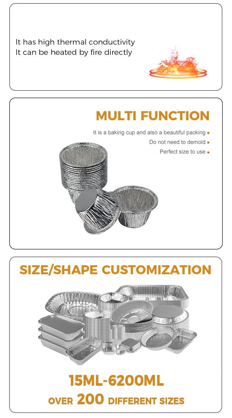 Yunchu Aluminiumfolie Fabrikant's eenmalige kleine ronde cake luchtfriteuse zilveren aluminiumfolie container maakt gebruik van 8011-O aluminiumfolie van voedselkwaliteit, die de Amerikaanse FDA-certificering voor voedselcontactveiligheid heeft doorstaan ​​en voldoet aan de EU SGS-veiligheidsnormen voor voedselcontactmateriaal. Na professionele tests heeft het geen geur en geen schadelijke resten. Het kan direct in contact komen met allerlei soorten voedsel. Het is niet gemakkelijk om te vervormen of te breken. Het is effectief lekvrij en anti-aanbaklaag. Het kan direct vloeibare ingrediënten bevatten, zoals cakebeslag, puddingvloeistof, saus, enz. Het buitenste rolrandontwerp is krasbestendig, waardoor het risico op krassen op uw handen wordt verminderd. Het temperatuurbestendigheidsbereik bestrijkt -40 ℃ tot 220 ℃ en kan worden aangepast aan luchtfriteuses, ovens, steamers en magnetrons (middelhoog vuur). Hij kan rechtstreeks in de heteluchtfriteuse worden geplaatst om minicakes en eiertaartjes te bakken, en kan ook worden gebruikt om bevroren ingrediënten direct na het ontdooien te verwarmen, waardoor aan verschillende kook- en bakbehoeften wordt voldaan.