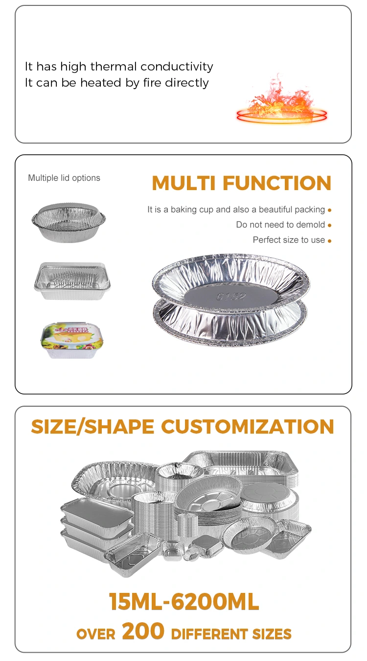 De ovale eier taart zilveren aluminiumfoliecontainers geproduceerd door de aluminiumfolie van de yunchu -fabriek in de ovel heeft de gunst van de markt gewonnen met zijn unieke ontwerp en uitstekende functionaliteit. Dit product maakt gebruik van geavanceerde technologie om een ​​vormontwerp uit één stuk te bereiken dat zorgt voor zelfs verwarming en gemakkelijke demold, waardoor het erg handig is voor het bakken van taartjes en cakes. Het is matig dik en duurzaam genoeg om hoge temperaturen te weerstaan ​​bakken.