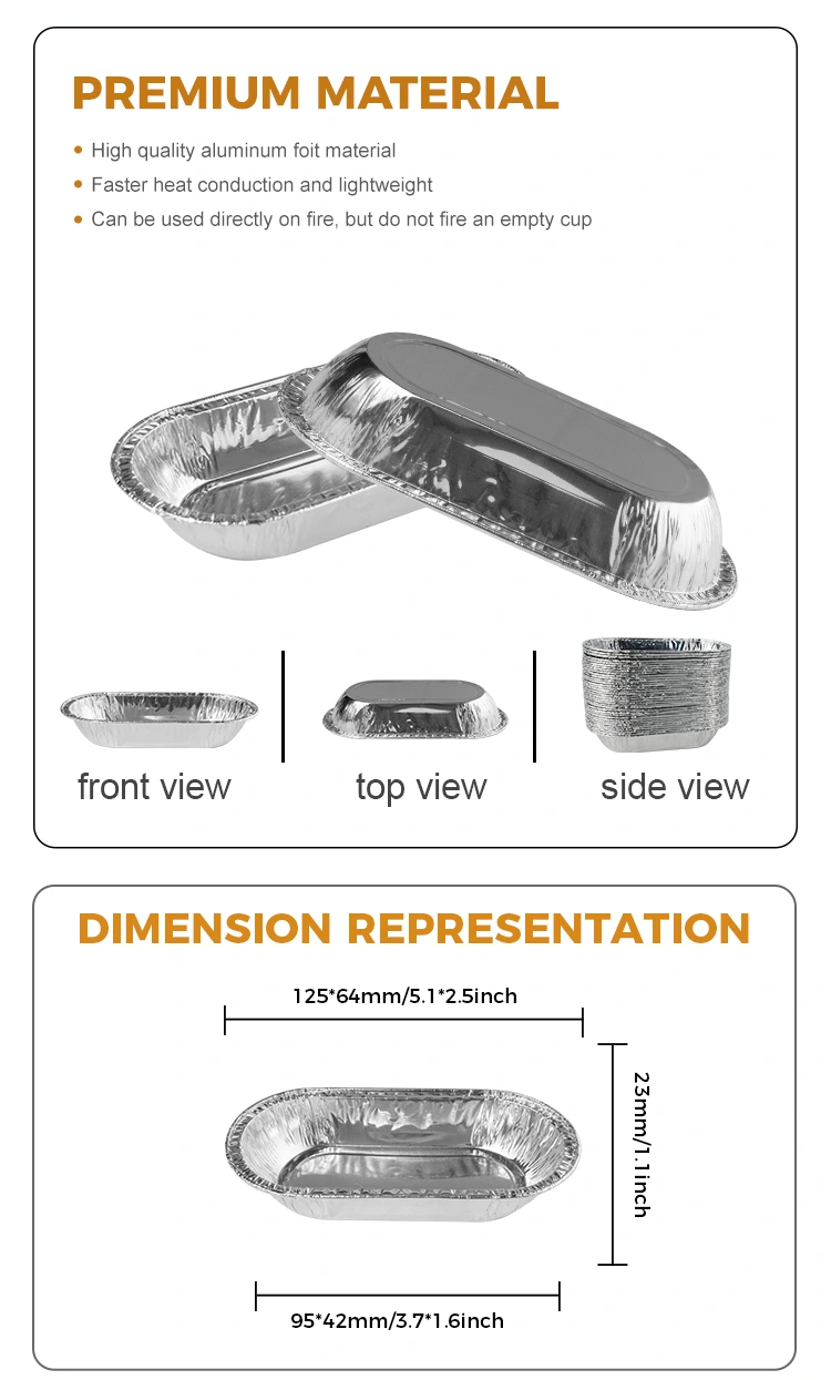 De yunchu ovale bakzilverfolie voedselcontainer is een zeer bescheiden grootte, met een bovendiameter van 125*64 mm (5,1*2,5 inch), een basisdiameter van 95*42 mm (3,7*1,6 inch), een hoogte van slechts 23 mm (1,1 inch) en een capaciteit van 105 ml (3,7 oz). Deze grootte is niet alleen gemakkelijk te dragen, maar kan ook aan verschillende behoeften aan verschillende gebruik voldoen.