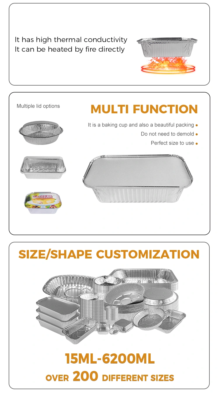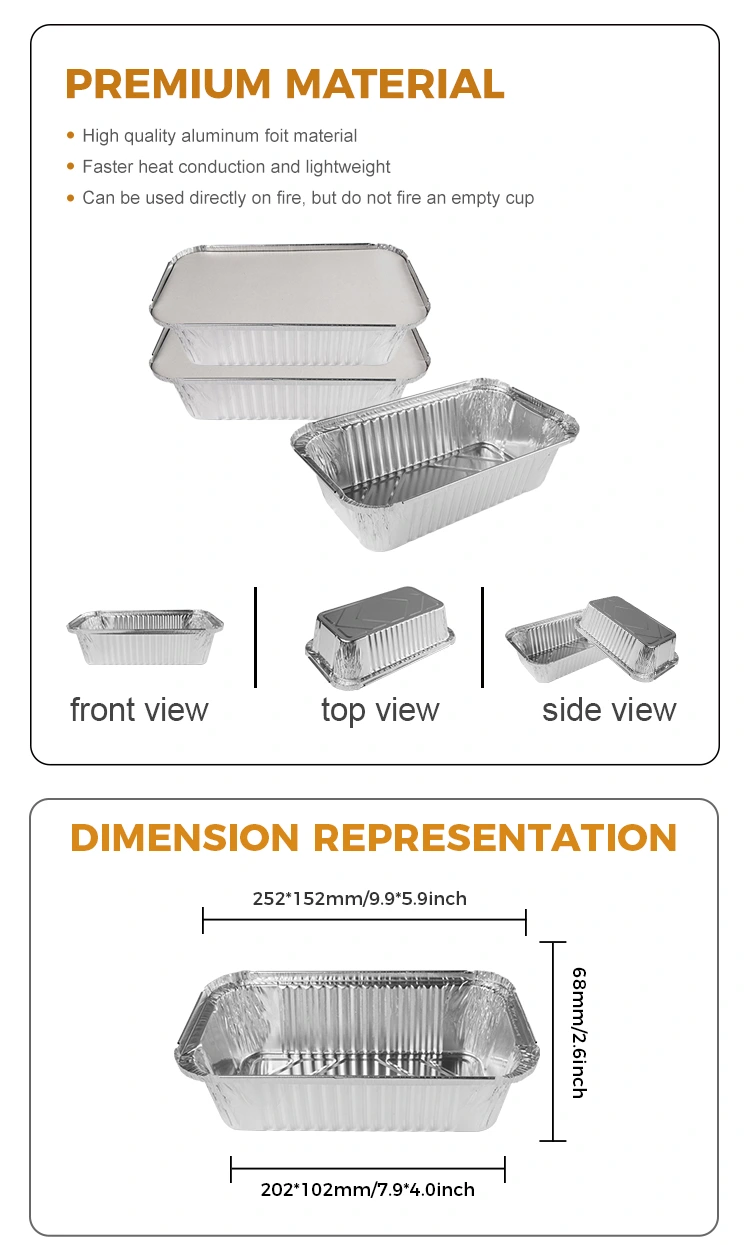 Yunchu aluminiumfolie Deze rechthoekige luchtfriteuten verpakking zilver aluminiumfoliecontainers is gemaakt van hoogwaardig 8011 aluminiumfoliemateriaal, dat uitstekende warmtisolatieprestaties heeft en de temperatuur van voedsel effectief kan behouden, waardoor het voedsel heerlijker en heerlijker wordt. Tegelijkertijd is onze rechthoekige BBQ -zilveraluminiumfoliecontainer ook uitgerust met een warmtebehoudsfunctie, die kan worden bereikt door het te matchen met een aluminiumfoliedeksel of plastic deksel in huisdieren, wat handig is voor aangepaste logo en dus het merkimago verbetert.