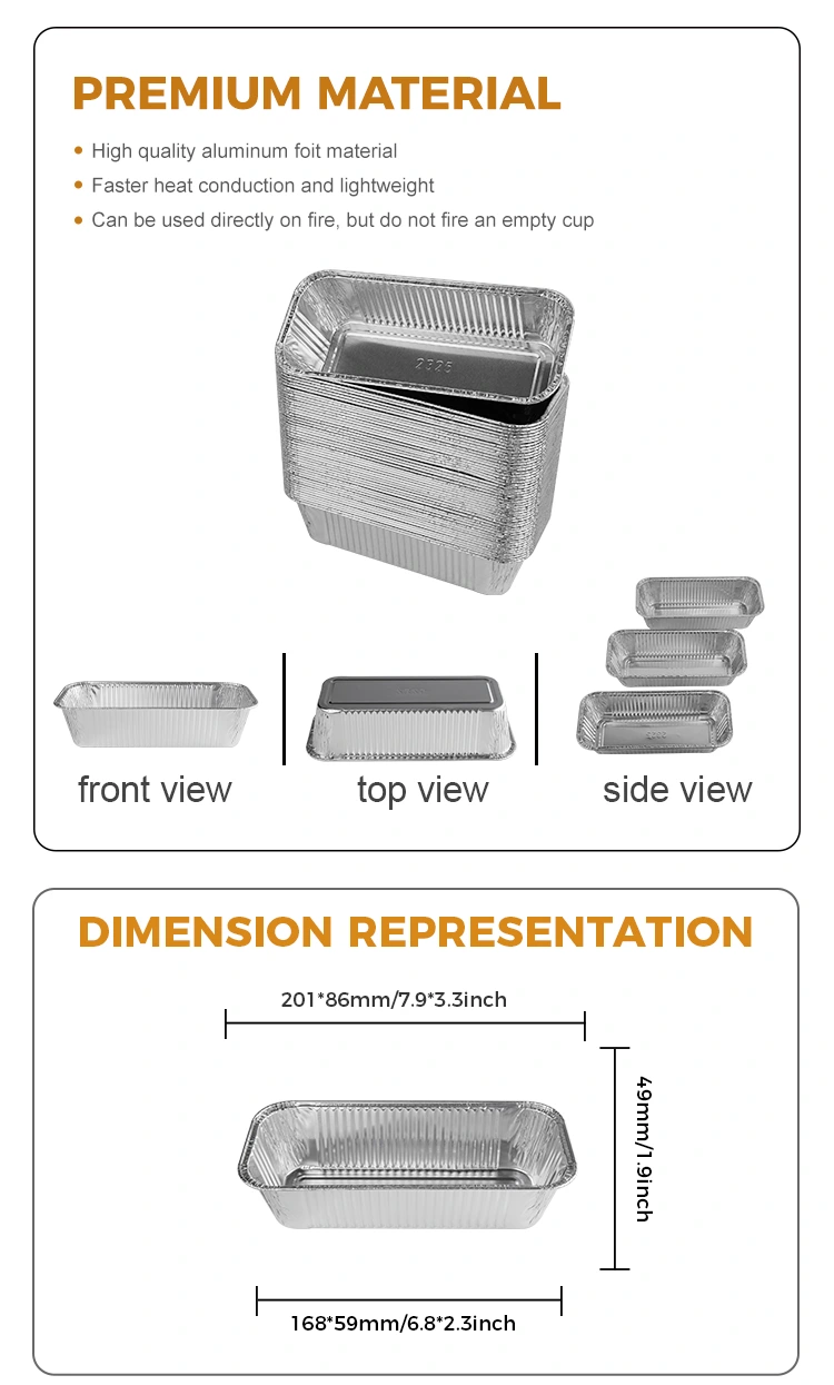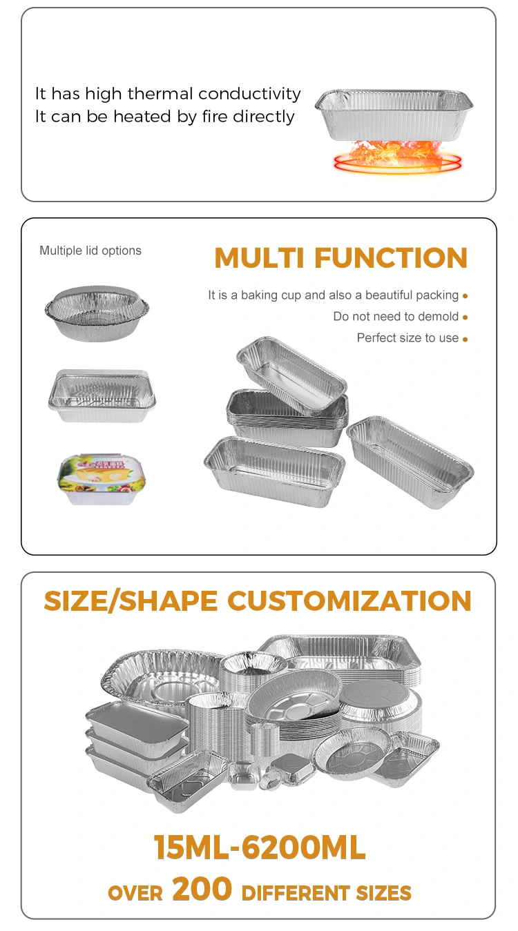 Yunchu Aluminium Foil Leverancier Model 2325 Rechthoekige luchtfriteuse Herhaalraken zilveren aluminiumfoliecontainers Hoogwaardig aluminiumfoliemateriaal is verdikt en is niet gemakkelijk te breken en kan worden verwarmd over een open vlam, deze aluminiumfoliecontainer is niet alleen mooi in uiterlijk, maar ook zeer praktisch. Het kan bestand zijn tegen bakken op hoge temperatuur, niet gemakkelijk te verbranden of te vervormen, en het ontwerp van de bodem is ook mooi en elegant, wat effectief kan voorkomen dat voedsel blijft plakken. Bovendien maakt het hoogzijdige ontwerp de combinatie van aluminiumfolie stabieler en gemakkelijker te gebruiken. Ongeacht de specificatie van de maat u kiest, deze aluminiumfoliecontainer past zich perfect aan aan verschillende potgroottes, die zich richten op uw diverse behoeften. Om meer consumenten in staat te stellen te genieten van producten en diensten van hoge kwaliteit, bieden we een verscheidenheid aan specificaties om uit te kiezen en kunnen we patroonafdrukken aanpassen op basis van uw behoeften om te voldoen aan gepersonaliseerde behoeften. Met een enkele MOQ van slechts 1000 stuks is het aankoopproces eenvoudig en snel en zijn de kostenprestaties extreem hoog. Als u vragen heeft of meer begrip nodig hebt over onze producten, neem dan gerust contact met ons op, wij zullen u graag van dienst zijn.