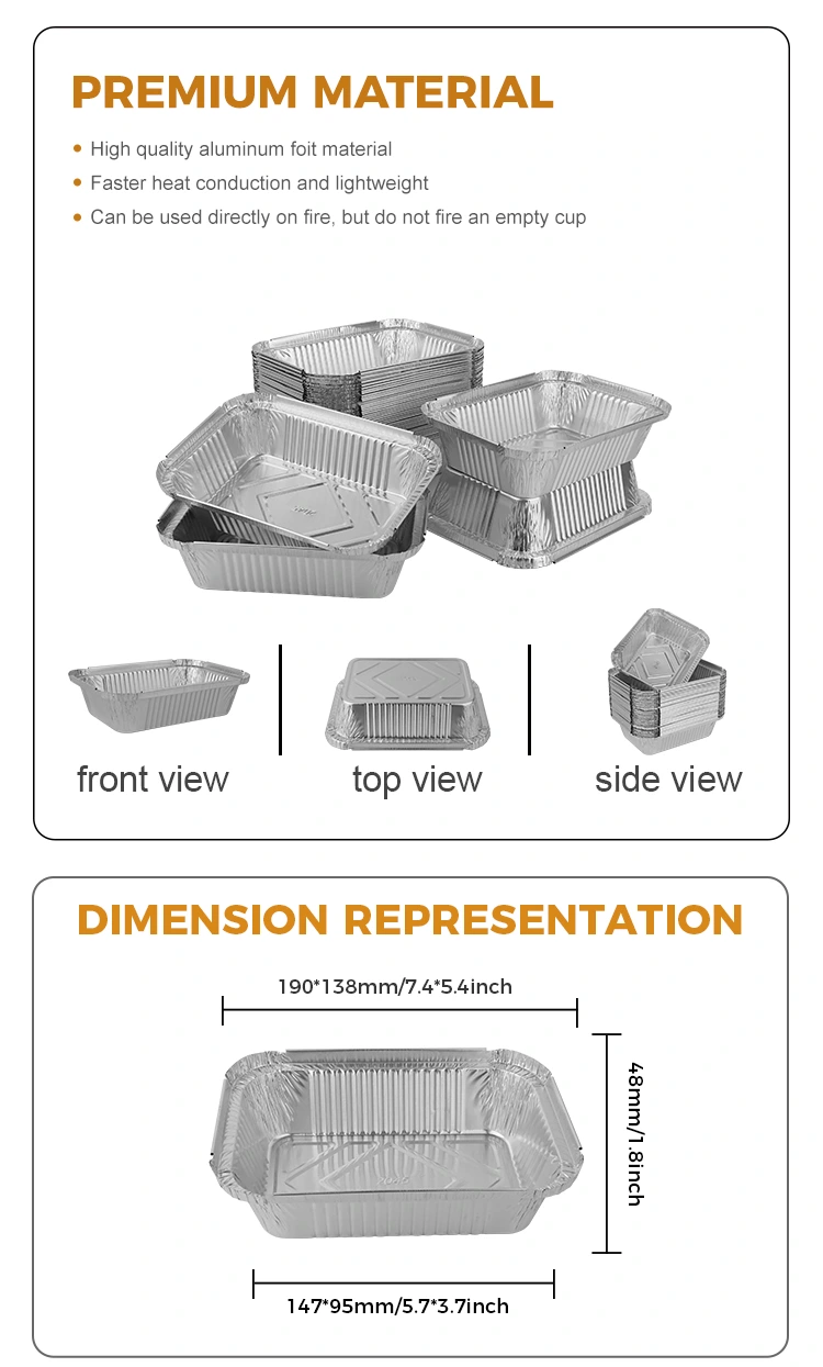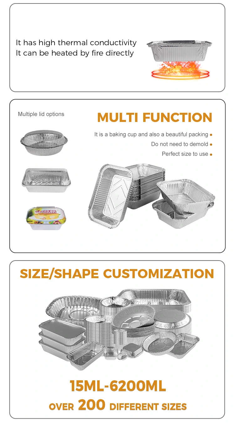 De lunchboxen van aluminiumfolie die wij leveren zijn gemaakt van 8011 aluminiumfoliemateriaal, dat uitstekende thermische isolatie-eigenschappen heeft en de temperatuur van voedsel effectief kan handhaven. In het bijzonder heeft onze rechthoekige zilveren aluminiumfoliecontainer voor het bakken van lunchboxen niet alleen warmtebehoudende eigenschappen, maar kan deze ook worden gebruikt met een deksel van aluminiumfolie om de gepersonaliseerde aanpassing van het LOGO te vergemakkelijken.