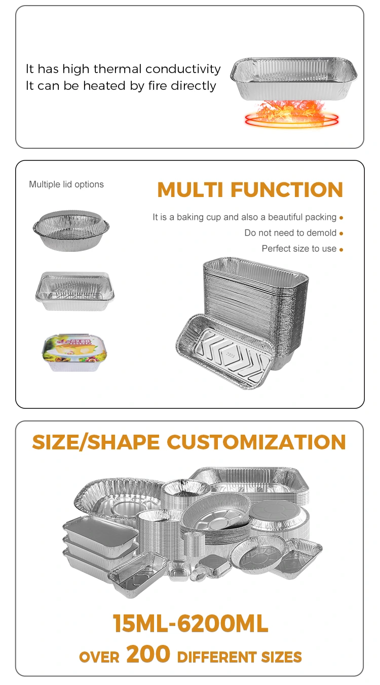 Kenmerken: Lunchbox Groothandel 8011 Aluminiumfoliemateriaal is gemaakt van een goed warmtebehoud, dat de temperatuur van voedsel kan behouden en het voedsel heerlijker kan maken. Bovendien heeft onze rechthoekige barbecue zilver aluminiumfoliecontainer ook een warmtebewaarfunctie, die kan worden geëvenaard met aluminiumfoliedeksel en plastic deksel met huisdieren, wat u handig is om uw logo aan te passen, de klantafdruk verder te verdiepen en uw merkimago te verbeteren.