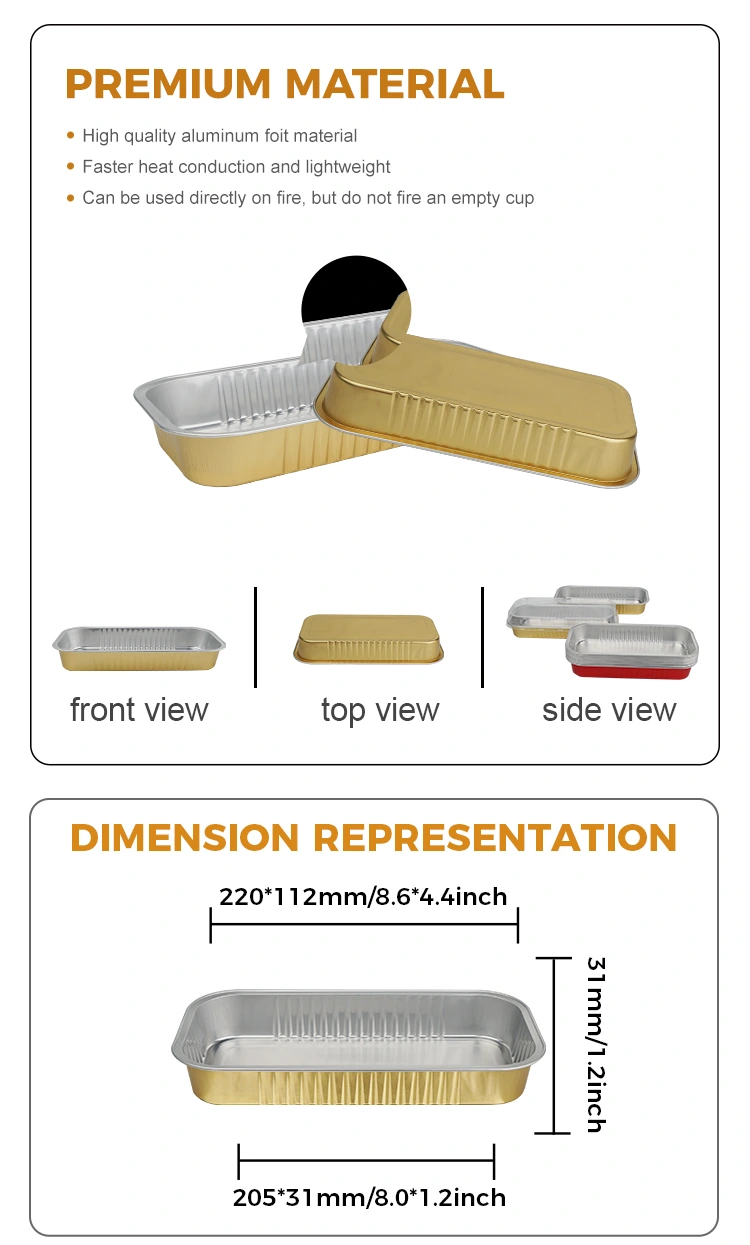 Van bakken en productie tot presentatie, opslag en afhalen, rechthoekige gouden bak Smoothwall aluminiumfoliecontainers hebben de dubbele voordelen van "uiterlijk + sterkte", waardoor elke heerlijke maaltijd de gebruikers op een meer verfijnde en veiligere manier kan bereiken. Kies ervoor, zodat bakken niet alleen een smaakgenot is, maar ook een allround upgrade van visie en beleving!