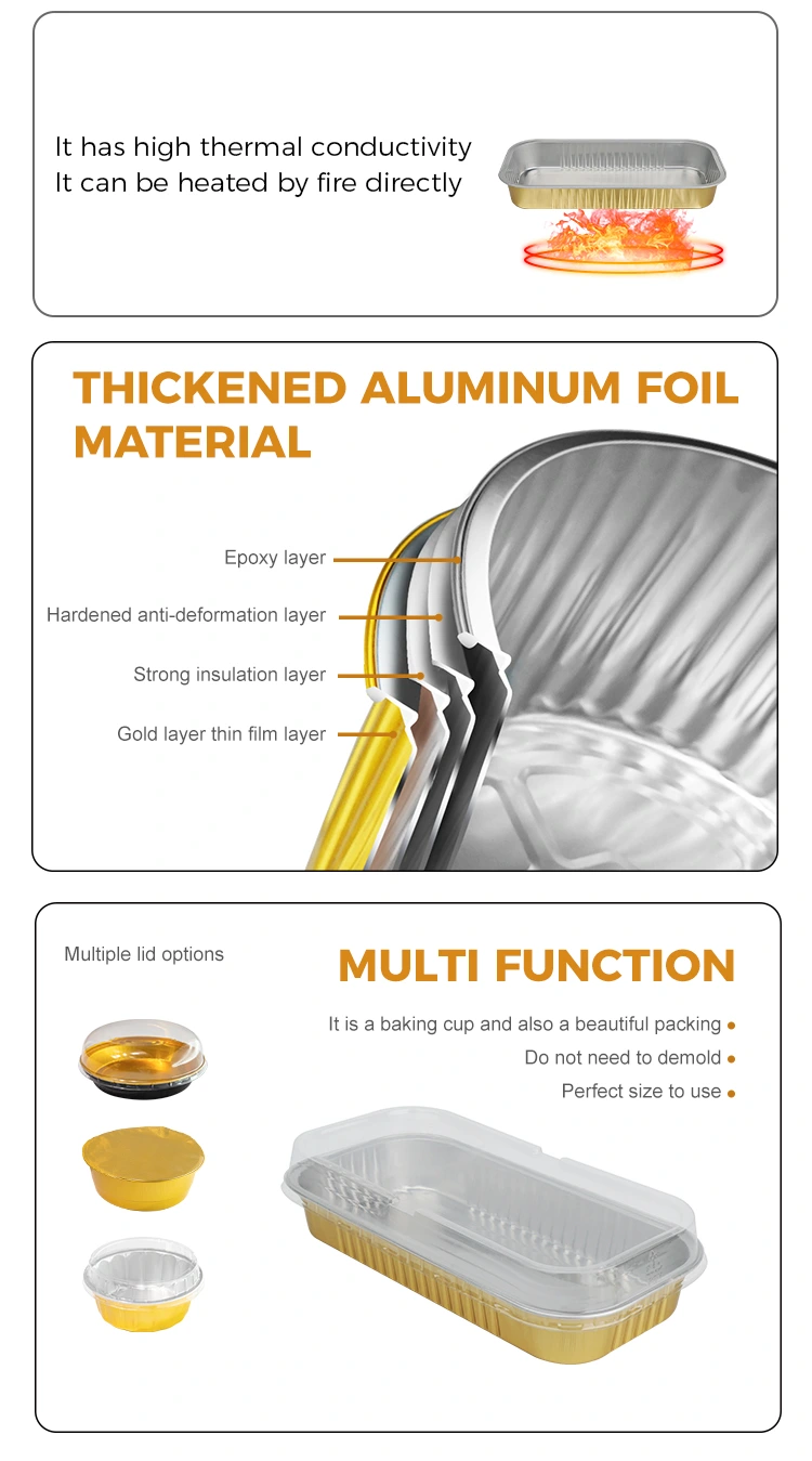 Dankzij de uitstekende thermische geleidbaarheid van aluminiumfoliemateriaal kan de ovenwarmte snel en gelijkmatig worden overgebracht naar de binnenkant van het voedsel, waardoor lokale problemen met aanbranden of vastklemmen worden vermeden. Bij het bakken van lange gebakjes sluit de doos nauw aan bij de vorm van het voedsel, waardoor vocht en aroma worden vastgehouden. Bij het bakken is de buitenkant krokant aan de buitenkant en de binnenkant zacht. De smaak is veel beter dan gewone glazen of plastic bakjes. De randen van de doos zijn afgerond, wat krasbestendig is en effectief voorkomt dat soep lekt. Rechthoekige goudgebakken Smoothwall aluminiumfoliecontainers zijn geschikt voor gebakken delicatessen met sauzen (zoals lavachocoladerepen, karamelnotenrolletjes).