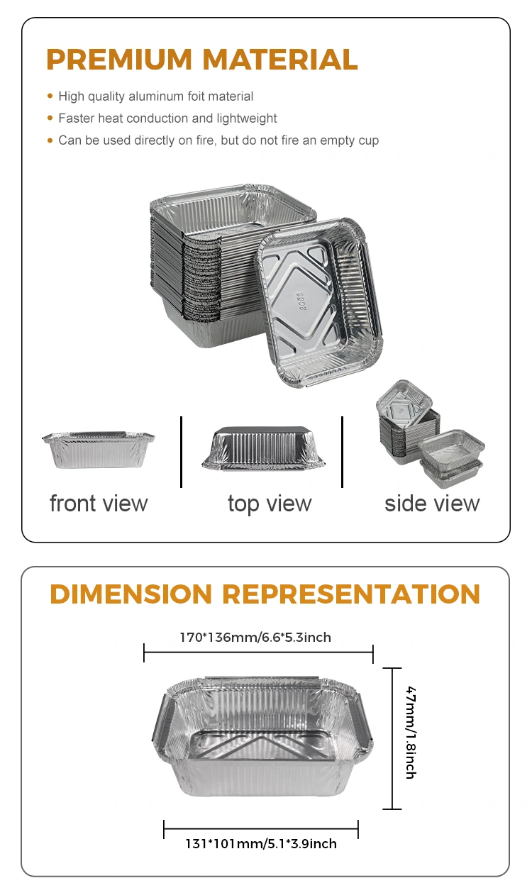 De Made in China Model 2056 Rechthoekige gratin is verpakte zilveren aluminiumfoliecontainers is een zeer bescheiden maat, met een bovendiameter van 170*136 mm (6,9*5,3 inch), een basisdiameter van 131*101 mm (5,1*3,9 inch), een hoogte van slechts 47 mm (1,8 inch (1,8 inch (1,8 inch). Deze maat is niet alleen gemakkelijk te dragen, maar voldoet ook aan verschillende gebruiksbehoeften.