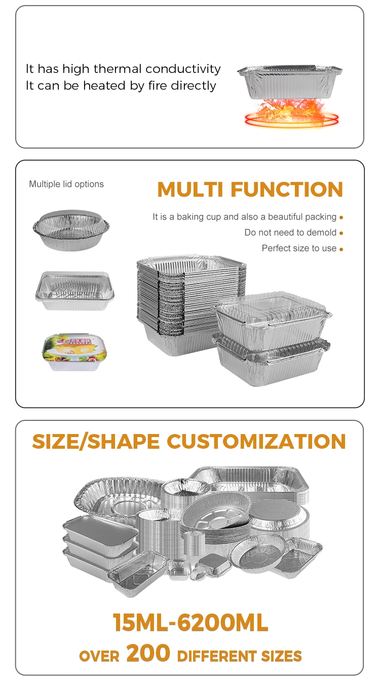 De rechthoekige gratin is verpakte zilveren aluminiumfoliecontainers geleverd door de leverancier van de aluminiumfolie van Yunchu is gemaakt van hoogwaardig 8011-0 zilvermateriaal met voedselkwaliteit. Deze container is geschikt voor een verscheidenheid aan kookmethoden, zoals luchtfritenten, barbecues, bakken en vooraf gemaakte gerechten, en kan snel voedsel opwarmen voor het dagelijks leven. Het is zeer flexibel, het materiaal is sterk en duurzaam en het is niet eenvoudig om te vervormen of te breken. Dankzij het verdikte ontwerp kan deze aluminiumfoliecontainer bestand zijn tegen open vlamverwarming, zorgt voor de veiligheid van de consument en heeft een goede temperatuur en vochtweerstand, waardoor het geschikt is voor veilig transport.