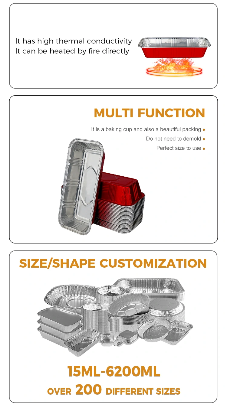 Yunchu Aluminiumfolie biedt u hoogwaardige rechthoekige rode bakkerijcatering zilveren aluminiumfoliecontainers, die zijn ontworpen om duurzaam en hittebestendig te zijn, de warmte gelijkmatig kunnen geleiden om verkoling te voorkomen en een sterke afdichting hebben om vers te blijven.