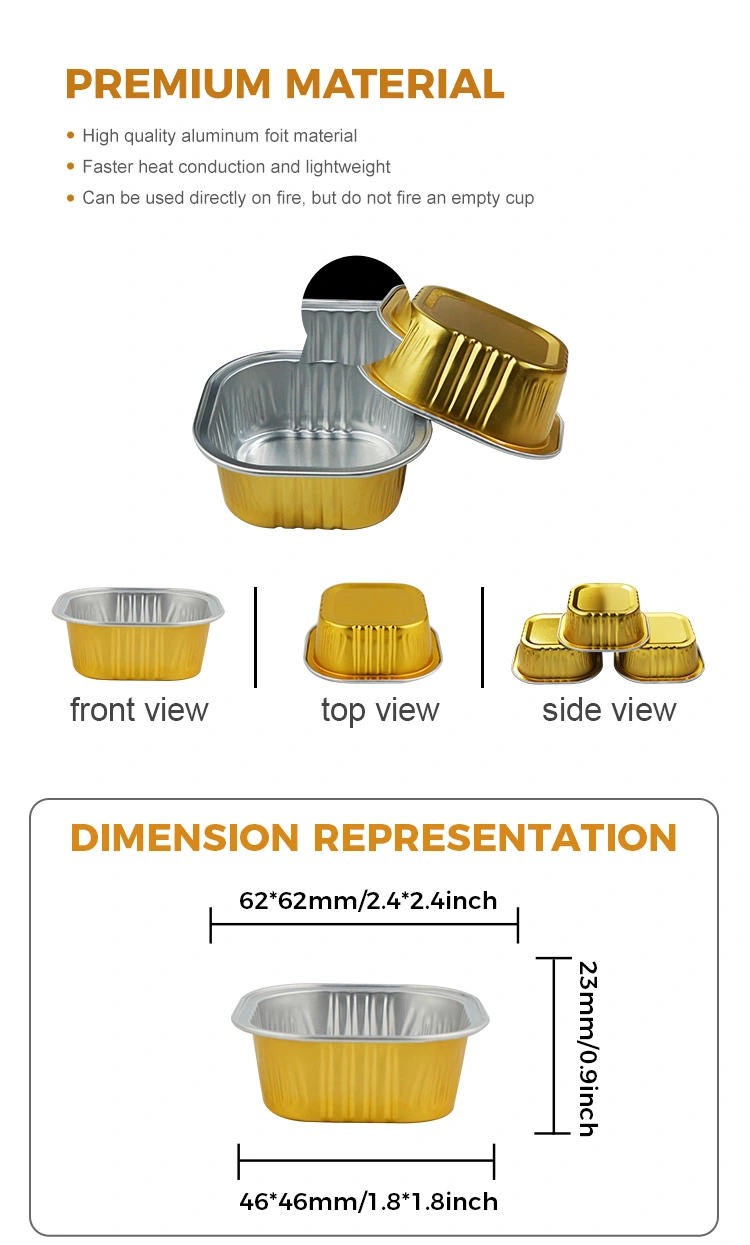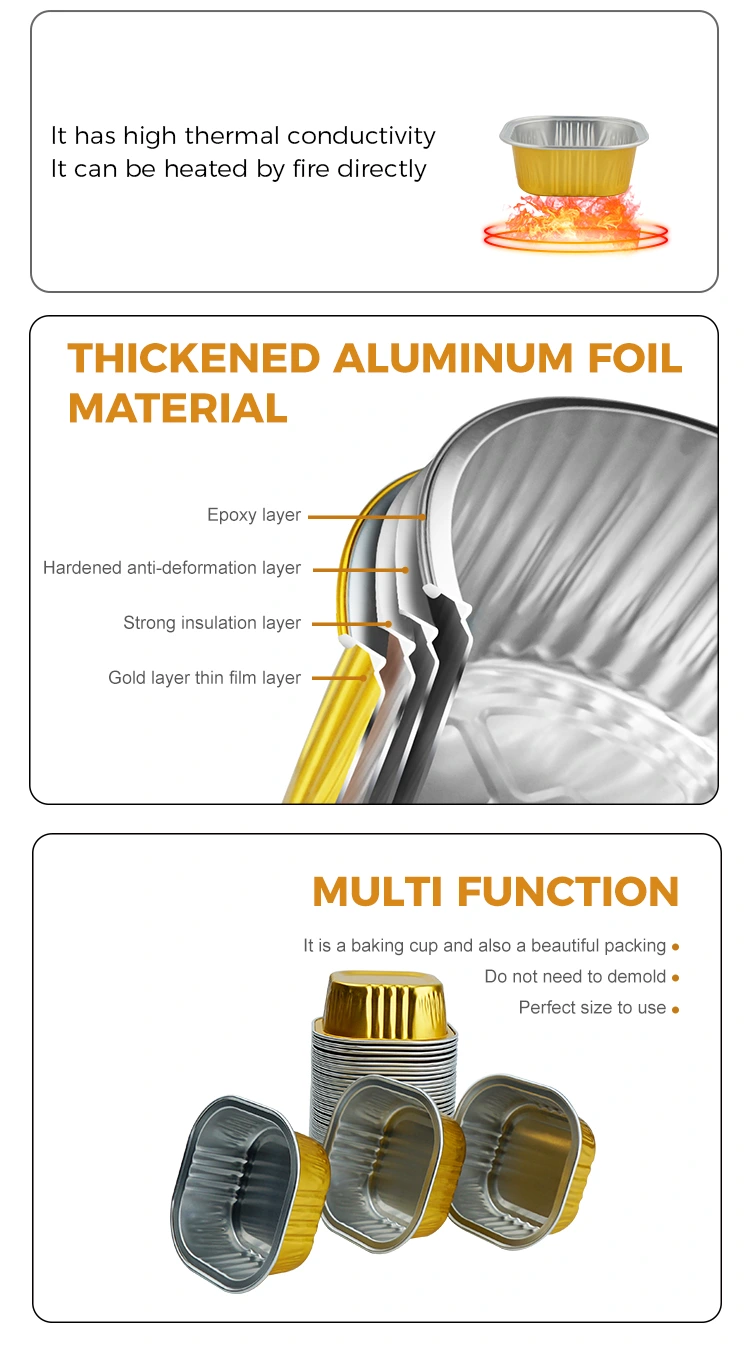 Yunchu aluminiumfoliefabrikant vierkante dessertbakbekers Smoothwall aluminiumfoliecontainers kunnen worden gebruikt in luchtfriteuses, bakken, sauzen, enz. Deze bakbekers hebben een speciaal versterkt ribontwerp en hun korte bekerlichaamsstructuur zorgt ervoor dat ze goede wrijvingseigenschappen hebben, niet gemakkelijk uitglijden, gemakkelijk mee te nemen en geen pijn doen aan handen en mond. Ze zijn geschikt voor het maken van een verscheidenheid aan desserts, waaronder cupcakes, custards, zandkoekjes, taarten, kaneelbroodjes, cheesecakes, custards en puddingen. Deze geribbelde structuur zorgt voor extra ondersteuning en is bijzonder geschikt voor gebruik in commerciële bakkerijen of grote supermarkten.