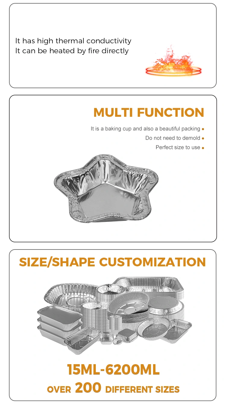 Leverancier van Yunchu-aluminiumfolie Stervormige taartvormen van aluminiumfolie voor het bakken Aluminiumfolievoedselcontainer is een hoogwaardige bakzilveren aluminiumfoliecontainer. Dit product is praktisch en lost effectief problemen op bij het maken van taarten of kleine etenswaren, zoals het afwassen van pannen en vetresten. De binnen- en buitenwanden van de bodem van de stervormige taartvormen van aluminiumfolie voor het bakken van voedselcontainers van aluminiumfolie zijn ontworpen om glad te zijn, waardoor plakken na het bakken wordt voorkomen en schroeien aan de onderkant wordt vermeden.